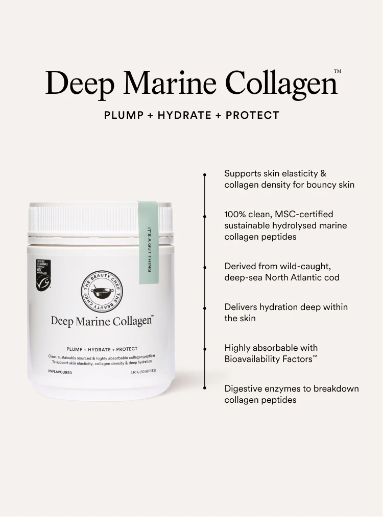 DEEP MARINE COLLAGEN™ contains a blend of ingredients, including 100% clean, certified sustainable marine collagen, to support skin elasticity, hydration, collagen density and protection deep within the skin.