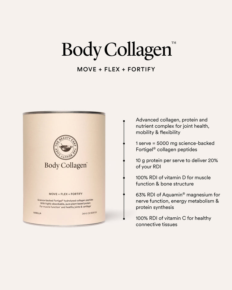 Body holding you back? Find freedom of movement with Body Collagen™. This fortifying collagen, protein and nutrient complex harnesses Fortigel® a highly researched form of type ll collagen peptides - scienfically backed to support healthy joints, cartilage and ligaments. Whether you're highly active or finding movement more challenging, reach for this versatile, gut-friendly formula to support your mobility, flexibility, muscle function and to keep your body moving freely.
