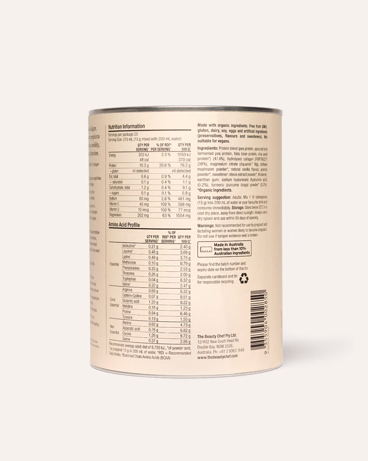 Protein blend (pea protein, sprouted and fermented pea protein, faba bean protein, chia seed protein*) (47.4%), hydrolysed collagen (FORTIGEL®) (38%), magnesium citrate (Aquamin Mg®), shiitake mushroom powder*, natural vanilla flavour, acerola powder*, sweetener: stevia extract powder*, thickener: xanthan gum, sodium hyaluronate (hyaluronic acid) (0.2%), turmeric (curcuma longa) powder* (0.2%). *Organic ingredients.