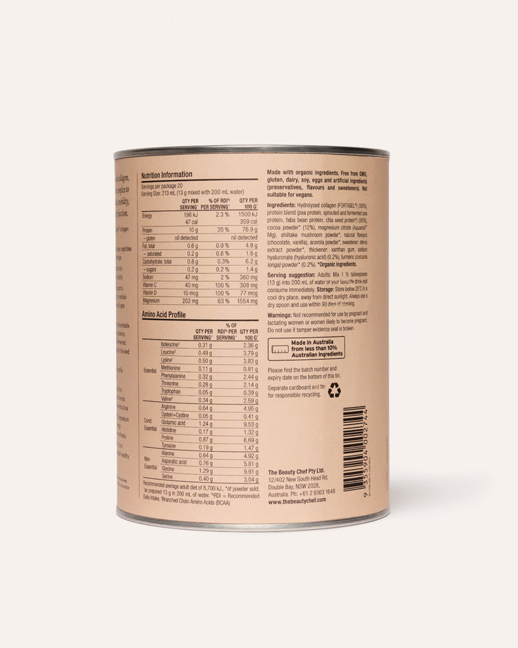 Hydrolsed collagen (FORTIGEL®) (38%), protein blend (pea protein, sprouted and fermented pea protein, faba bean protein, chia seed protein*) (36%), cocoa powder* (12%), magnesium citrate (Aquamin Mg®), shiitake mushroom powder*, thickener: xanthan gum, sodium hyaluronate (hyaluronic acid) (0.2%), turmeric (curcuma longa) powder* (0.2%). *Organic ingredients.
