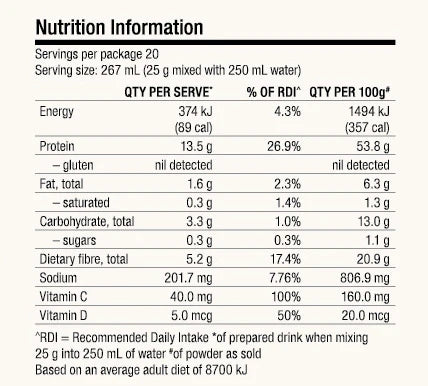 Vanilla: Sprouted fermented pea protein* (56.2%), sprouted pea fibre* (24%), Jerusalem artichoke inulin* (5.4%), sprouted brown rice protein* (4%), natural vanilla flavour (2.6%), acerola powder* (1.3%), matcha powder* (1.3%), shiitake mushroom powder* (1%), oat grass powder* (0.8%), greens blend (spirulina, chlorella, alfalfa grass, wheat grass, barley grass)* (0.8%), fruit & vegetable blend (beetroot, carrot, kale, spinach, acai, apple, grape, broccoli sprout)* (0.48%), chia seed* (0.4%), hemp powder* (0.4%), stevia leaf extract* (0.36%), Bio-Fermented Nutrient Blend with Flora Culture® [(chickpeas*, mung beans*, brown rice*, sweet potato*, lentils*, buckwheat*, quinoa*, millet*, sea minerals, pepitas*, linseed*, sunflower seeds*, agave*, molasses*, queen garnet plum, ginger rhizome*, lemon juice concentrate, lactic acid starter culture (Bifidobacterium infantis, B. lactis, Lactobacillus acidophilus, L. delbrueckii sub. lactis, L. fermentum, L. paracasei, L. rhamnosus, Lactococcus lactis sub.cremoris, L. lactis sub. lactis biovar diacetylactis, L. lactis sub. lactis, Leuconostoc mesenteroides, L. pseudomesenteroides)) (0.4%), xanthan gum, berry blend (strawberry*, raspberry, blueberry*, cherry, pomegranate*, cranberry) (0.08%), cinnamon bark powder* (0.08%), Lactobacillus rhamnosus GUT5Y™ (0.05%) and maqui berry powder* (0.04%). *Organic ingredients