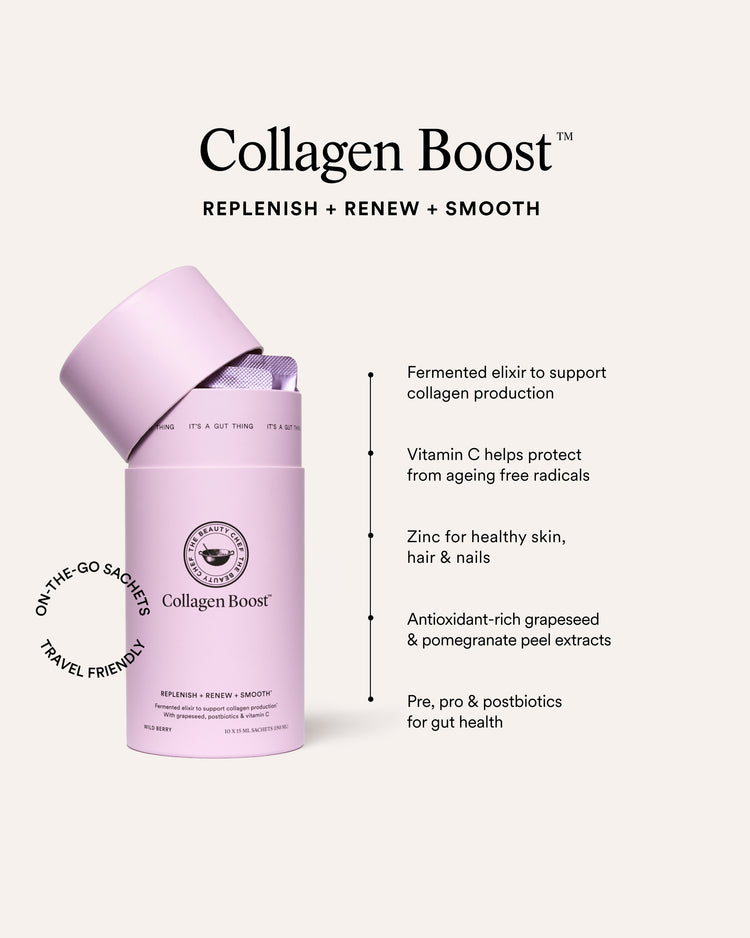 Enjoy this cult favourite collagen elixir anytime, anywhere with our on-the-go sachets. Designed to support collagen production, with gut-friendly bacteria, vitamin C and zinc for healthy skin, hair and nails.
