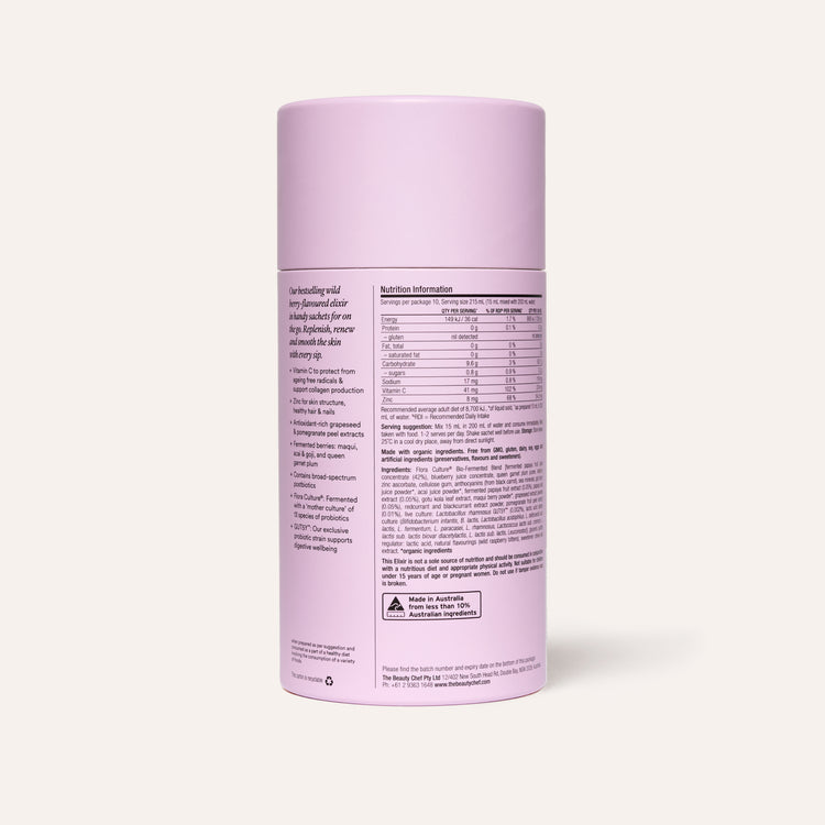 A natural wild-berry flavoured elixir with skin-boosting papaya, pomegranate, queen garnet plum and acai.