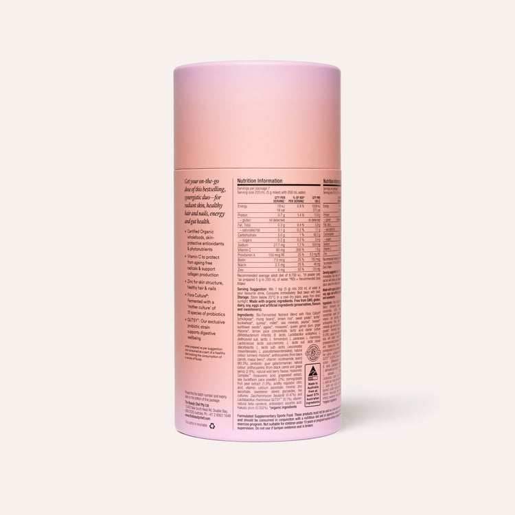 Glow® contains wholefood ingredients, fermented using our unique Flora Culture® process. This process breaks down and converts ingredients into a more active form and creates broad-spectrum pro and postbiotics