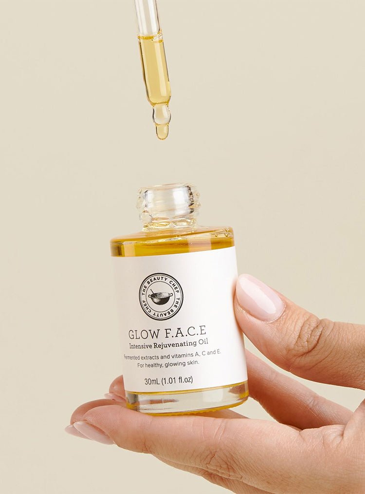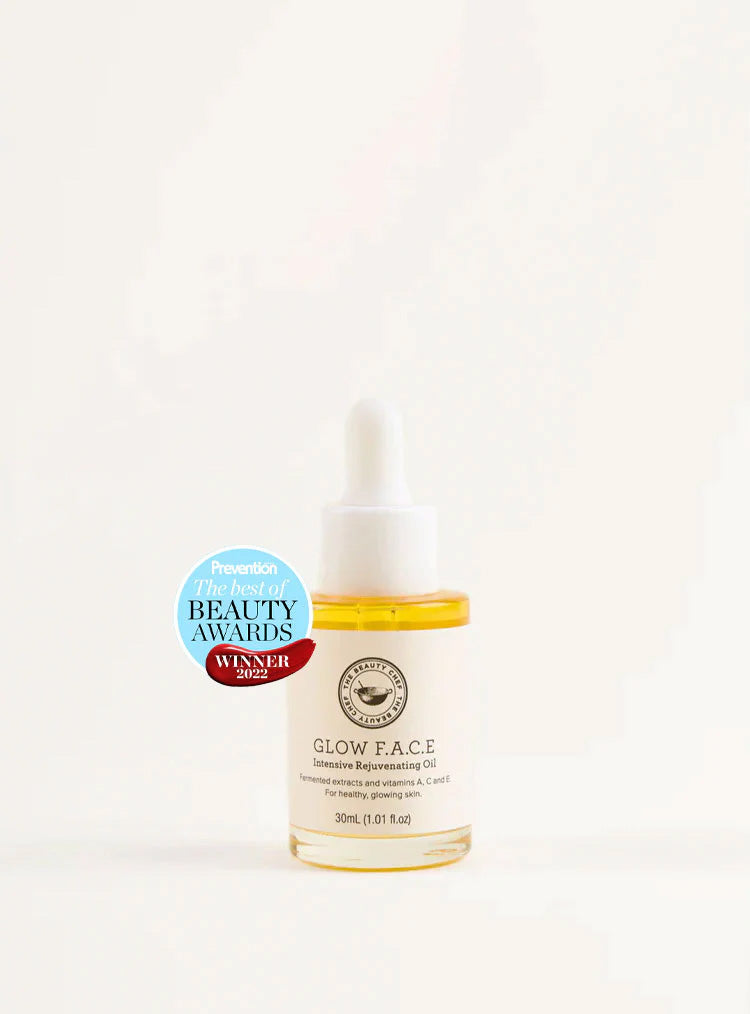 GLOW F.A.C.E is an intensive rejuvenating oil with a unique fermented prebiotic and postbiotic extract alongside Bakuchiol, vitamins A, C and E and vegan squalene. This luxurious formula works to reduce the appearance of fine lines and wrinkles, tone, firm and nourish to support healthy, glowing and radiant-looking skin.