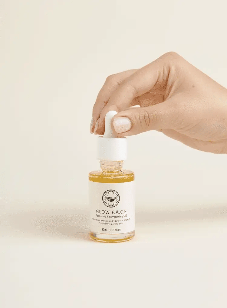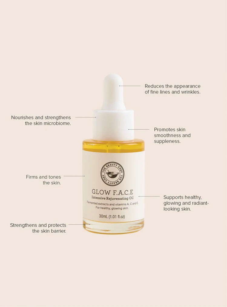 GLOW F.A.C.E is an intensive rejuvenating oil with a unique fermented prebiotic and postbiotic extract alongside Bakuchiol, vitamins A, C and E and vegan squalene. This luxurious formula works to reduce the appearance of fine lines and wrinkles, tone, firm and nourish to support healthy, glowing and radiant-looking skin.