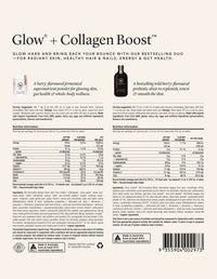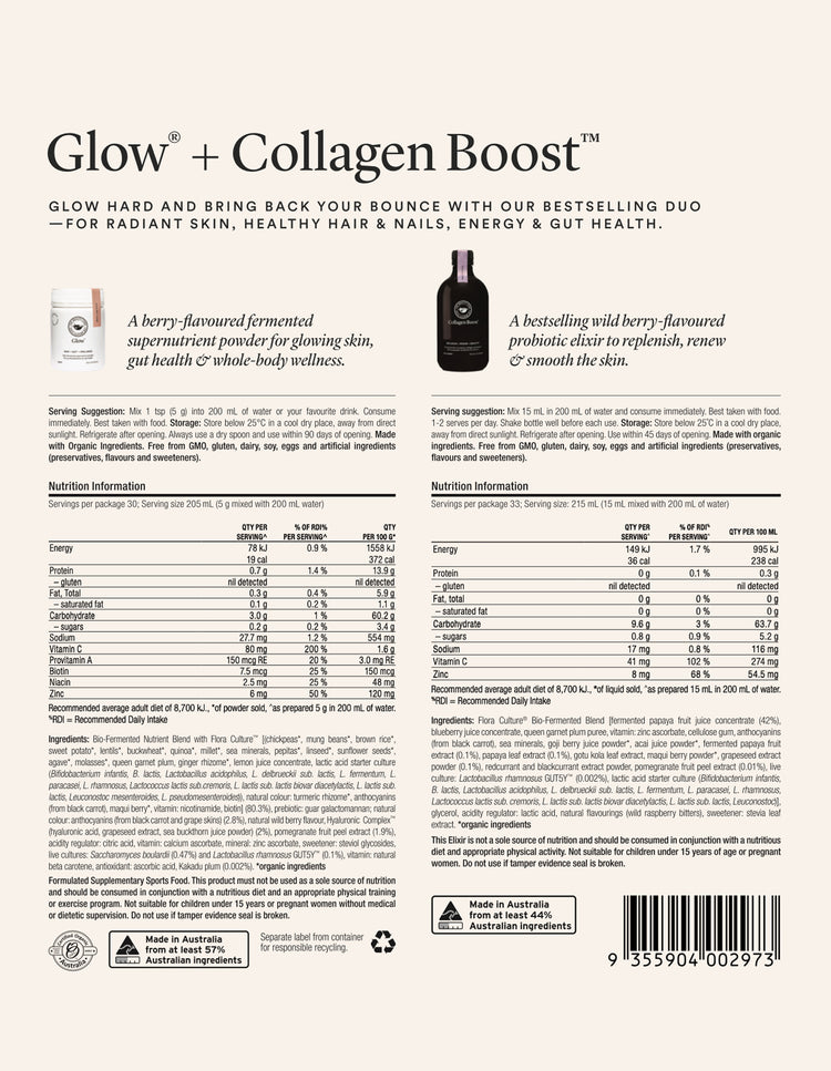 Glow®: A daily beauty powder for radiant skin and gut health, now supercharged with our exclusive Hyaluronic Complex™—an antioxidant-rich blend of sea buckthorn, grapeseed extract & hyaluronic acid to deliver your glowiest results yet. With 18 Certified Organic wholefoods including bio-fermented maqui berries, queen garnet plum and pomegranate fruit peel extract, vitamin C to help boost collagen production and zinc to support healthy hair and nails. Plus provitamin A, broad-spectrum B vitamins and more probiotics and postbiotics thanks to our more potent fermentation process, this berry-flavoured blend promotes luminous skin—from the inside out.