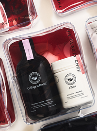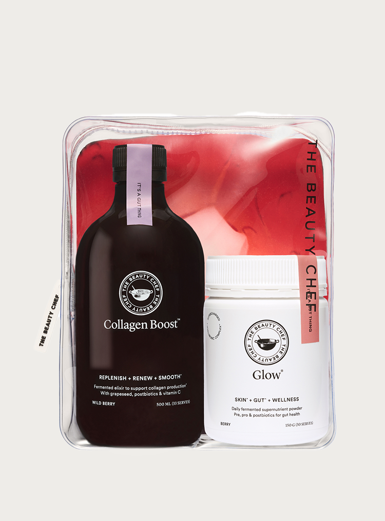 This limited edition kit comes in a handy reusable cosmetic pouch and contains our bestselling duo to boost collagen production, strengthen skin and nourish the gut.