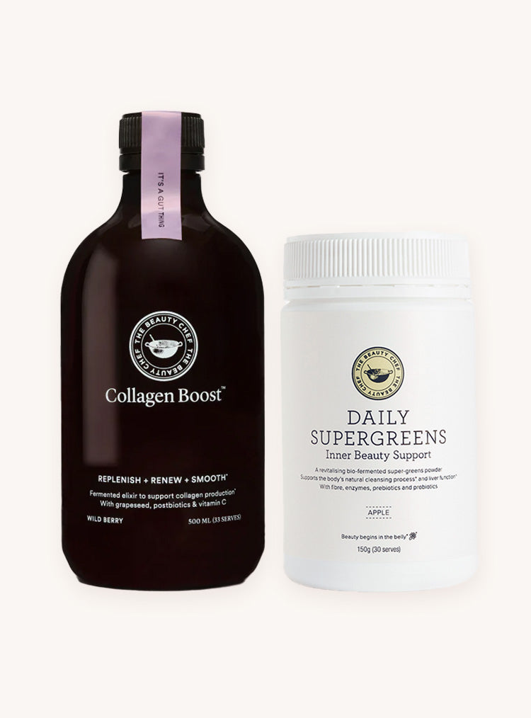 DAILY SUPERGREENS Inner Beauty Support is a bio-fermented super-greens powder to help the body realign and support your natural cleansing processes. With fibre from banana starch and Jerusalem artichoke, choline to aid liver function and fat metabolism, plus enzymes, prebiotics and probiotics for a healthy belly.