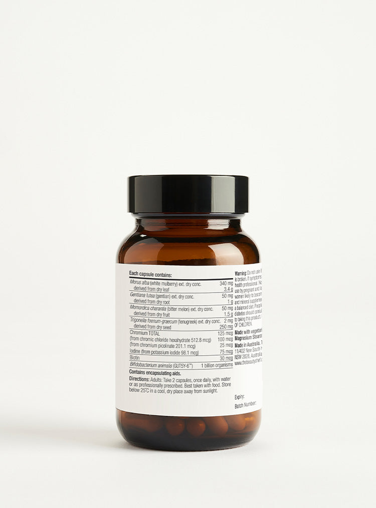 Each capsule contains: Each capsule contains: Gentiana lutea (gentian) ext. dry conc. 50mg derived from dry root 1g, Momordica charantia (bitter melon) ext. dry conc. 50mg derived from dry fruit 1.5g, Trigonella foenum-graecum (fenugreek) ext. dry conc. 2mg derived from dry seed 250mg, Morus alba (white mulberry) ext. dry conc. 340mg derived from dry leaf 3.4g, chromium 100 micrograms (from chromic chloride hexahydrate 512.8 micrograms), chromium 25 micrograms (from chromium picolinate 201.1 micrograms) (Total chromium 125 micrograms), iodine 75 micrograms (from potassium iodide 98.1 micrograms), biotin 30 micrograms, Bifidobacterium animalis ssp lactis (GUT5Y-6™) 1 billion organisms. Contains encapsulating aids